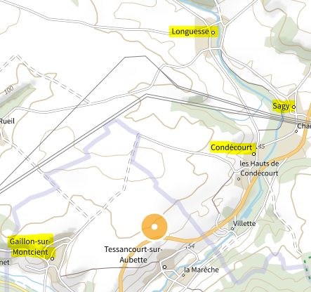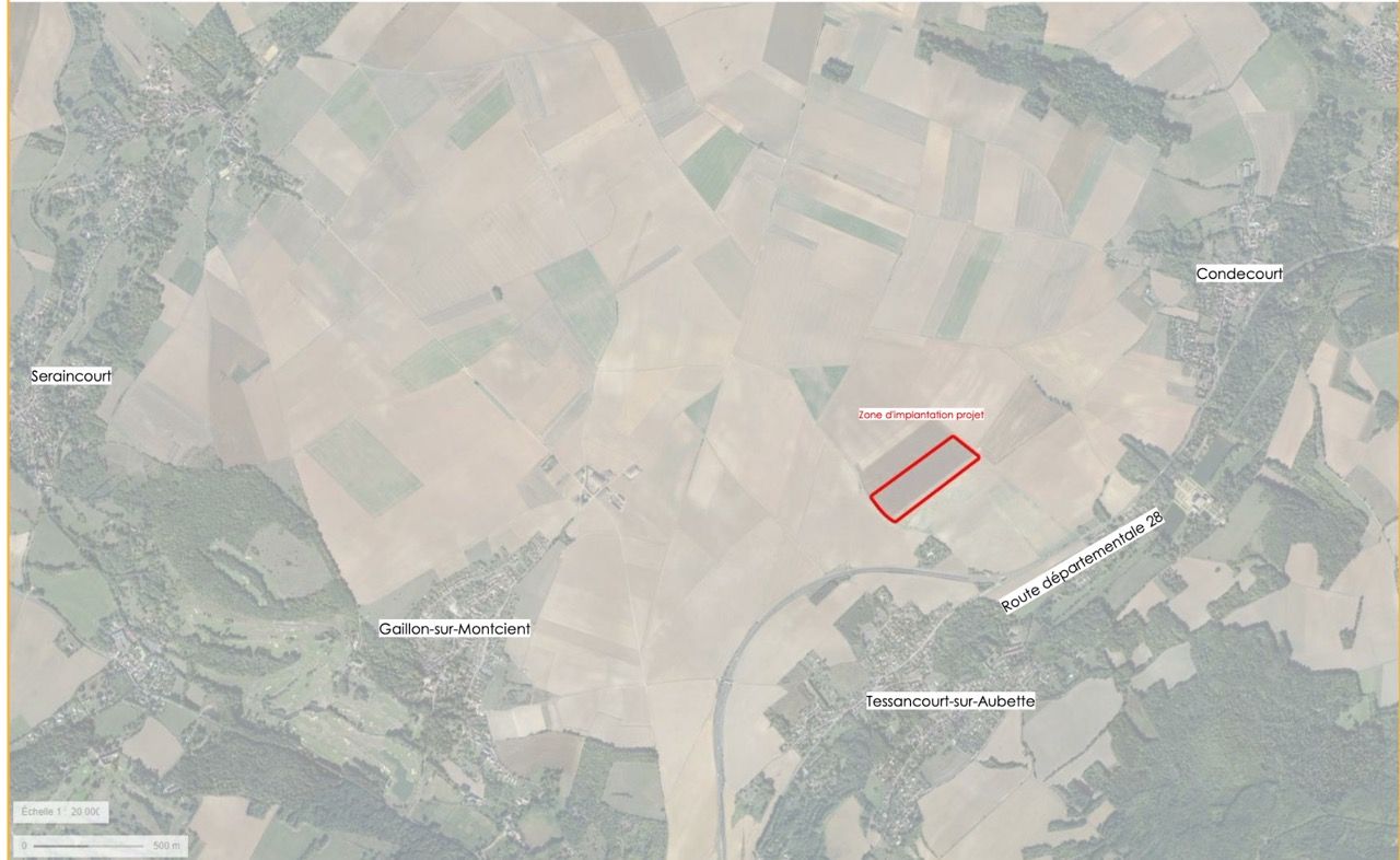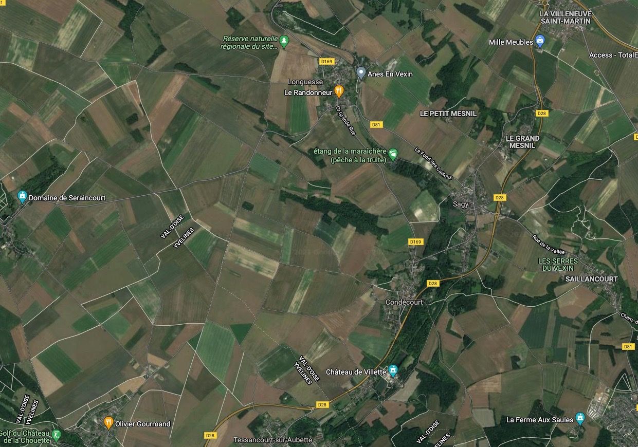 Le site de production (rouge) est situé sur la commune de Tessancourt sur Aubette. Le siège des exploitations associées se trouvent à Gaillon sur Montcient, Condécourt, Sagy et Longuesse. Les parcelles exploitées qui permettront la fourniture de substrats agricoles à l’unité de méthanisation sont situées sur le plateau agricole situé autour de l’unité (environ 960 ha)